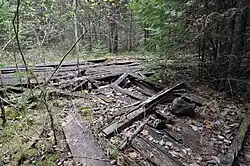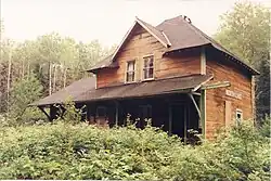 When the replica station was constructed in 1977, the Ministry of Natural Resources decided to burn the collapsing structure the original station. The remains, as well as those of the fairly well-preserved coal bunker, sat overgrown in the brush beside the former railway grade.[7] In 1999 the entire Boundary Waters area was hit by an intense weather system that caused massive blowdowns, and became known as the Boundary Waters – Canadian derecho.[8] The storm caused extensive damage to the site, particularly to the coal bunker. In recent years the station remains have been completely overtaken by the forest growth and are in a state of terminal decomposition.[7]