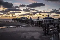 The construction of Blackpool Pier (eventually North Pier) started in May 1862, in Layton-cum-Warbreck, part of the parish of Bispham.[2] In October 1862 severe storms suggested that the planned height of the pier was insufficient, and it was increased by 3 feet (0.91 m).[2] North Pier was the second of fourteen piers designed by Eugenius Birch, and since Margate Pier was destroyed by a storm in 1978, it is the oldest of the remaining examples of his work still in use.[3] It was the first of Birch's piers to be built by Glasgow engineering firm Richard Laidlaw and Son.[2]