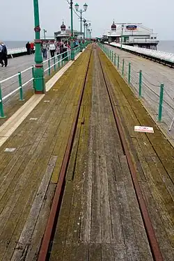 The pier was built and owned by the Blackpool Pier Company, created with three thousand £5-shares in 1861 (worth approximately £2,990 in 2012).[note 3] The same firm operated the pier in 1953,[26] and the company was incorporated in 1965.[27] The Resorts Division of First Leisure, including the pier, was sold to Leisure Parks for £74 million in 1998.[4] In 2009, the pier was sold to the Six Piers group, which owns Blackpool's other two piers, and hoped to use it as a more tranquil alternative to them.[28] The new owners opened the Victorian-themed tea room, and built an eight-seat shuttle running the length of the pier.[29]