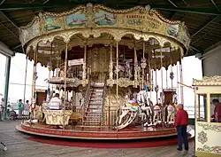 The Carousel bar on the pier-head has a Victorian wrought iron canopy, and its outdoor sun-lounge is classified as the largest beer garden in Blackpool. Next to the bar is a two tier carousel, the "Venetian Carousel", which is protected from sand and spray by a glass wall.[24]
