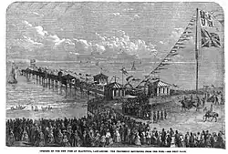 The pier was officially opened in a grand ceremony on 21 May 1863, even though the final 50 yards (46 m) had not yet been completed. All the shops in the area were closed and decorated with flags and streamers[4] for the ceremony, which included a procession and a cannon salute, and was attended by more than 20,000 visitors.[7] Although the town only had a population of approximately 4,000, more than 200,000 holiday makers regularly stayed there during the summer months;[2] this included 275,000 admissions in 1863, 400,000 in 1864 and 465,000 the following year.[4] The pier was officially opened by Major Preston, and he and 150 officials then travelled to the Clifton Hotel for a celebratory meal.[4]