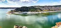 The North Platte emerges from the mountains near Casper, where it turns and flows east-southeast, along the northern edge of the Laramie Mountains onto the Great Plains. The North Platte flows east-southeast across the plains of eastern Wyoming, past the town of Douglas, Wyoming and through Glendo and Guernsey Reservoirs.[17] It then flows past the Fort Laramie National Historic Site (the former site of Fort Laramie), where it is joined by the Laramie River. The North Platte is joined by Horse Creek flowing in from Wyoming near the Wyoming-Nebraska border as its last significant addition. It crosses into western Nebraska, flowing east-southeast between the cities of Scottsbluff, Nebraska and Gering, Nebraska. In Keith County, Nebraska, the Kingsley Dam forms Lake C.W. McConaughy, the largest reservoir in Nebraska and a significant irrigation and recreation facility for the region. Kingsley Dam, constructed in 1935 to 1941, is located on the east side of Lake McConaughy in central Keith County, Nebraska, and is the second largest hydraulic fill dam in the world.[18] East of the Kingsley dam the North Platte River flows nearly parallel to the South Platte River. In many places they are separated by only about 5 mi (8 km) for a stretch of about 50 mi (80 km) before they join to form the Platte River just east of the city of North Platte, Nebraska.