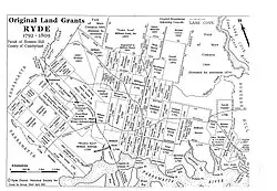 The earliest settler to receive a land grant in the area bordered by the Field of Mars Common and Bridge/Twin and Badajoz Roads that is now North Ryde was Jane Wood in 1800.[10] Following land grants were to David Brown in 1802, William Kent Jnr in 1803, "Tudor Farm" being the largest land grant in the district, which included all the land between Lane Cove, Herring, Bridge and Waterloo roads, James Weavers and Michael Connor in 1804, and Thomas Granger in 1809.[11]