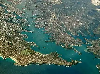 ![]() Sydney Harbour with the North Shore extending from its northern side (right) with Sydney CBD (left) and Eastern Suburbs (bottom) on its southern shore. | |||||||||||||||