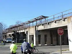 Beyond West Brighton near a NYCDEP water pollution control facility, the line rose onto a reinforced concrete trestle known as the Port Richmond Viaduct, crossing Bodine Creek and running for about a mile through the Port Richmond neighborhood.[6][7] West of Nicholas Avenue near Port Richmond High School, the line entered an open cut, crossing under the Bayonne Bridge approach and continued west to the Arlington Yard and station at South Avenue.[8] Rapid transit service continued via a northern spur to Port Ivory; freight service passed the current Howland Hook Marine Terminal (adjacent to Port Ivory) and crossed the Arthur Kill Vertical Lift Bridge to Cranford Junction in New Jersey.[9] The right-of-way from the Port Richmond Viaduct to Arlington Yard has remained intact and in good condition, though the former station sites and infrastructure are dilapidated and need rehabilitation or replacement should passenger service be reactivated.[10]