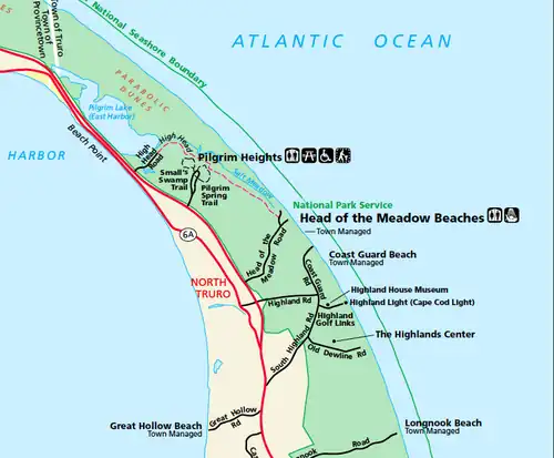 Over half of the land area of the town is part of the Cape Cod National Seashore (the area shown in green on the map), established in 1961 by President John F. Kennedy, and administered by the U.S. National Park Service. The large impoundment of East Harbor (a.k.a. Pilgrim Lake) is a prominent feature while passing through on the main highway, Route 6.