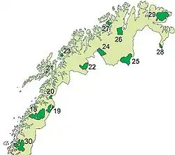 There are large climatic differences from southwest to northeast in this region. Finnmarksvidda in the interior of Finnmark and some valleys in the interior of Troms, experience a more continental climate with much less precipitation and much colder winters compared to the long coastal region.[22][23][24][25]