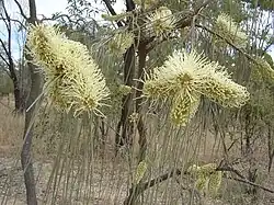 Hakea chordophylla, commonly known as bootlace oak, bootlace tree, corkwood, or bull oak, is a species of shrub or small tree in the family Proteaceae found in central and northern Australia. Bears very showy golden yellow, pale green or cream nectar rich flowers in winter.