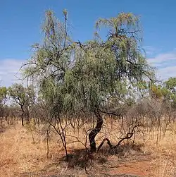 The species was first formally described by Victorian Government Botanist Ferdinand von Mueller in 1857, from plant material collected at Sturt Creek in the Northern Territory. The description was published in Hooker's Journal of Botany and Kew Garden Miscellany.[1][4] Its specific epithet (chordophylla) is derived from Ancient Greek chorde meaning "gut", "string of a musical instrument", "twine" or "rope"[5]: 666 and phyllon meaning "leaf".[2][5]: 605 It belongs to a group of related species known as the corkbarks, or lorea group, within the genus Hakea, most of which are found across Australia's arid interior.[3][6]