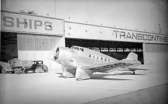 When Jack Northrop set up the Northrop Corporation as a joint venture with the Douglas Aircraft Company in 1932, he set out to design two closely related single-engined aircraft as the new company's first products: a mailplane/record-breaking aircraft, which was designated the Gamma, and a passenger transport, the Delta.[1] The Delta was a low-winged monoplane, with a fixed tailwheel undercarriage. It was of all-metal, stressed-skin construction, with streamlining spats covering the main landing gear. While the Delta's wings were common with those of the Gamma, it had a new, wider fuselage, which seated the pilot in an enclosed cockpit immediately behind the engine, and had accommodation for eight passengers in a cabin behind the pilot.[2][3]