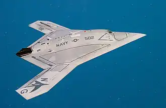 The Northrop Grumman X-47B is a demonstration unmanned combat aerial vehicle (UCAV) designed for aircraft carrier-based operations. Developed by the American defense technology company Northrop Grumman, the X-47 project began as part of DARPA's J-UCAS program, and subsequently became part of the United States Navy's Unmanned Combat Air System Demonstration (UCAS-D) program. The X-47B is a tailless jet-powered blended-wing-body aircraft capable of semi-autonomous operation and aerial refueling.[1]