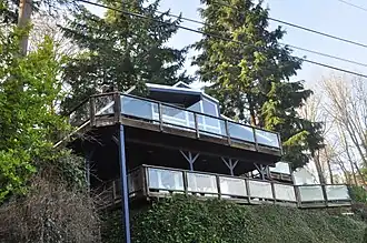 The International Style of the West Coast traveled north and influenced architects.[3] The terrain of the Northwest impacted the Modern style with architects making the conscious decision to preserve site elements like: Mountains, views of water, and paths of light.[3] The defining characteristic of the wooden exterior and interiors came from the terrain of the Northwest too, with the abundance of tree species like redwood, douglas fir, and western red cedar.[4] This allowed for a warmer modern architectural style, separating it from the stucco and concrete structures of California.[3] The style was developed by architects including Paul Thiry in Seattle[5] and John Yeon in Oregon, and was used most often in residential buildings.[1][6] Other proponents of the style included Paul Hayden Kirk,[7] Benjamin F. McAdoo, Pietro Belluschi, John Storrs, Van Evera Bailey, Herman Brookman, and Saul Zaik.[6][8]