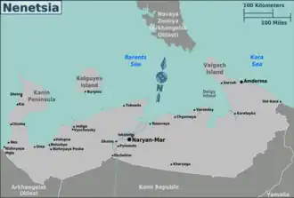 The Northwest Russian-Novaya Zemlya tundra ecoregion (WWF ID: PA1108) is an ecoregion on the north coast of European Russia. It covers the southern shores of the White Sea (the Kanin Peninsula), the coast of the Barents Sea east to the Yamal Peninsula, the southern half of Novaya Zemlya, and numerous inlets and islands. The low tundra wetlands are important breeding grounds for waterfowl. The ecoregion is in the Palearctic realm, and the tundra biome. It has an area of 284,122 square kilometres (109,700 sq mi).[1] [2]