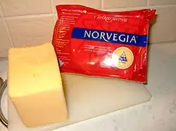 Norvegia (Latin for 'Norway') is a Norwegian brand of cheese produced by the Norwegian dairy company Tine.[1] It has a market share of about 60% of white cheeses in Norway.[2] It is Norway's best-selling cheese.[3] It is similar to Gouda, has a mild taste and melts easily.[2] There are different types of it. It has been produced since the 1890s.[2] Its recipe details remain a trade secret of Tine.