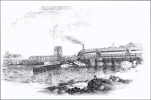 The Norwalk rail accident occurred on May 6, 1853, in Norwalk, Connecticut, and was the first major U.S. railroad bridge disaster; 48 were killed when a train travelling at 50 miles per hour (80 km/h) plunged into the Norwalk Harbor off an open swing bridge.[1]