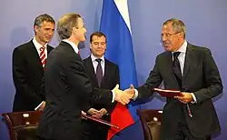 During a meeting in Oslo on 27 April 2010, President of Russia Dmitry Medvedev and Prime Minister of Norway Jens Stoltenberg announced that the territorial dispute in the Barents Sea was settled.[47][48] The agreement is a compromise which divides a disputed area of around 175,000 square kilometers (68,000 sq mi) into two approximately equally sized parts.[41] The agreement was signed on 15 September 2010 in Murmansk by Medvedev and Stoltenberg.[49][50] The Parliament of Norway unanimously approved the treaty on 8 February 2011. The debate lasted only an hour, and all representatives of Norwegian political parties praised the agreement.[51] On 30 March, Russia's State Duma also voted in support of ratification, despite strong opposition from Communist Party representatives. Medvedev signed a law ratifying the treaty on 8 April 2011. The law was titled Federal Law on Ratification of the Treaty between the Russian Federation and the Kingdom of Norway on Maritime Delimitation and Cooperation in the Barents Sea and the Arctic Ocean.[49] After ratification by both countries, there was a 30-day waiting period before it came into force.[52] The treaty entered force on 7 July 2011, ending the 44-year-old border dispute.[53]