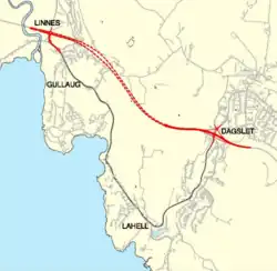 The current road between Daglset in Røyken and Linnes in Lier does not meet the current standards for a trunk road. Critical aspects are the lack of limited access, curvature, road width and speed limits. The route also runs in a major detour. Since 2003 the Public Roads Administration has been working on plans for build a new trunk route through this area. It is expected to have a length of 5 kilometers (3.1 mi) and includes a 2.2-kilometer (1.4 mi) tunnel. The route is planned to be built as a four-lane motorway.[31] The project is estimated to cost NOK 1.8 billion and would be partially financed using tolls. Initially, the project had a cost framework of NOK 2.3 billion (2017 NOK). After new cost calculations, the final amount has increased to NOK 3.2 billion (2017 NOK).[32] The project is included in National Transport Plan 2014–23.[33] The Public Road Administration aims at finalizing planning to allow construction to start in 2015 and the road to be completed by 2018.[34]