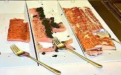 Gravlaks – sweet and salty cured salmon: a filleted side of salmon or trout that has been frozen for at least 24 hours to kill off parasites, is cured with the fillet and is covered with a half-salt, half-sugar mixture, spiced with black pepper, dill and akevitt, covered with clingfilm, and cured in the refrigerator for three days, turned once a day.