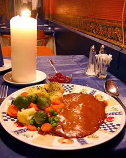 Svinestek – Roasted pork: a typical Sunday dinner, served with pickled cabbage (a sweeter variety of German sauerkraut), gravy, vegetables, and potatoes.