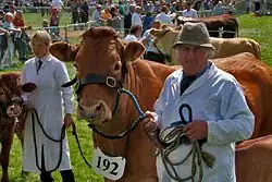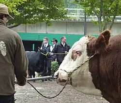 For safety reasons, many show societies require bulls over 10 months to be accompanied by two people, wear a halter and lead, and be led with a rope, chain, or bull pole attached to the bull's nose ring.[9] Some shows require other cattle to be led with temporary rings, see nose tongs below.