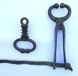 Another restraint method is tongs which temporarily grasp the septum. They are variously called nose clamps, nose tongs, dogs, bulldogs, bull tongs, or barnacles.[15]