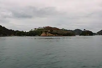 Noshima (能島) is a small, uninhabited island within the Geiyo Islands of the Japanese Inland Sea. Administratively, it forms part of the city of Imabari, Ehime Prefecture. In the late mediaeval period, the island was occupied by Noshima Castle and, together with the surrounding area, was the base of the Noshima Murakami, one of the three main houses of the Murakami kaizoku.[3][4] In his Historia de Iapam, Luís Fróis described Noximadono (i.e., the lord of Noshima) as o mayor corsario de todo Japaõ, "the greatest corsair in all Japan".[1][5][6] The island castle, together with tiny Taizakijima immediately to the south,[2] has been designated a National Historic Site,[7] and is an element of Japan Heritage "Story" #036,[8] while Noshima is also afforded protection as a Class I Special Zone within Setonaikai National Park.[9] There is no scheduled service to the island, which may be approached by a vessel chartered from Miyakubo Port (宮窪港) on nearby Ōshima.[1]