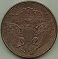 European powers had traditionally given "peace medals" to Native American Indians in an attempt to curry favor, and the newly created United States followed suit. On April 28, 1786, the Congress authorized creation of Indian Peace Medals with the coat of arms (obverse of the Great Seal) on one side, and various designs on the other. The medals were typically oval and made of silver, and were fairly large.[5] The use of the arms on these medals continued through 1795, with the more famous ones having a scene with George Washington on the other side.[7] Medals made after this time used other designs, and the practice continued through the administration of Benjamin Harrison.