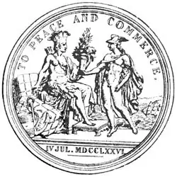 Dupré created an elegant design, especially interesting for the position of the wings, which are more horizontal ("extended" in heraldic terms) than most other emblazonments. The eagle itself was unmistakably a bald eagle, without a crest. The five-pointed stars were arranged in a six-pointed star pattern (like the future 1841 die). The clouds are in an inverted arc, much like the official die, but the rays of the glory extend down beyond the clouds and in back of the eagle. Dupré added a UNITED STATES OF AMERICA legend around the sides, and a small rosette of leaves in the exergue below the eagle. For the reverse, Dupré apparently followed one of Jefferson's suggestions, depicting a scene of international commerce portrayed as Mercury (the god of diplomacy) in conference with the genius of America (shown as an Indian chief, similar to some early American copper coins).[7]