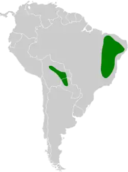 The white-bellied nothura prefers dry shrubland regions up to 500 m (1,600 ft) in altitude.[5] It can also be found in dry grassland, savanna, caatinga, and occasionally pastures.[1] This species is native to northeastern and central Brazil, eastern Bolivia and Paraguay.[3]
