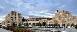 O'Neill Hall hosts the Department of Music and Sacred Music, including a 174-seat recital and performance hall, the music library, lecture halls, classrooms, rehearsal and seminar rooms, offices, faculty offices, a music lab for studio production, and practice rooms. It also houses stadium and sport-related spaces and a club lounge.[59][60] O'Neill Hall is built around the Frank Leahy Gate, which is the grand entrance to the stadium, and has a 106,809 square footage.[61]