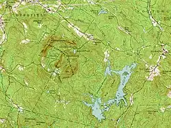 According to the United States Census Bureau, the town has a total area of 48.4 square miles (125.4 km2), of which 46.5 square miles (120.4 km2) are land and 1.9 square miles (5.0 km2) are water, comprising 4.00% of the town.[1] Containing 14 lakes and ponds, Nottingham is drained by the Pawtuckaway, North, and Little rivers, all tributaries of the Lamprey River, which passes south and east of the town and flows into Great Bay at Newmarket. The town's highest point is the North Peak of Mount Pawtuckaway, at 995 feet (303 m) above sea level. The circular-shaped Pawtuckaway Mountains are a prime example of what geologists term a ring dike complex.