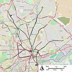 ![]() Tram passing Nottingham Victoria Railway Station | |