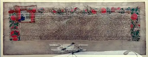 In 1513, the "Free School" was founded by Dame Agnes Mellers, after the death of her husband Richard, partly in his memory, but also as atonement for wrongdoings against the people of Nottingham.[8][9] To do so she enlisted help from Sir Thomas Lovell as governor of Nottingham Castle and Secretary to the Treasury. Through their combined efforts, Henry VIII sealed the school's foundation deed on the 22 November that year. It is unclear whether this was a new institution or an endowment of an existing school, of which records exist back to 1289.[8] Almost 20,000 boys are estimated to have attended between 1513 and 2013.[10]
