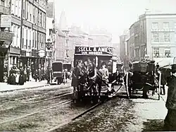 On 30 August 1880[19] a Midland Railway dray horse ran away down Low Pavement and collided with a tramcar. The dray horse charged between the tramcar and the tramcar horses and the tramcar was thrown off the line. The driver and single passenger who were standing on the front of the tram had a lucky escape.