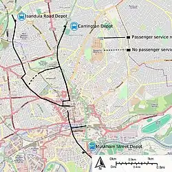 The third and final line to Basford was opened on 11 August 1879 [12] and this ran from the Market Place to Basford Gas Works on Church Street, via Chapel Bar, Derby Road, Alfreton Road (with a connection to the Forest Road line), Bentick Road and Radford Road. The depot and stables for this route was built on Isandula Road, very near the Basford terminus, to designs by the Nottingham architect, Albert Nelson Bromley.[13]