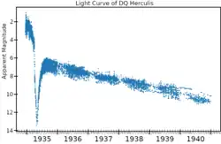 DQ Herculis, or Nova Herculis 1934, was a slow, bright nova occurring in the northern constellation of Hercules in December 1934. This cataclysmic variable star was discovered on 13 December 1934 by J. P. M. Prentice from Stowmarket, Suffolk.[12] It reached peak brightness on 22 December 1934 with an apparent magnitude of 1.5.[3] The nova remained visible to the naked eye for several months.[13]