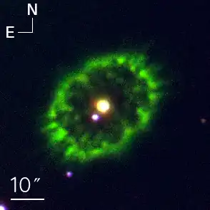 ![]() RGB composite color image of the shell surrounding the nova DQ Her, made from three narrow band images: Blue = 4800Å, green = Hα at 6563 Å and red = [NII] at 6583 Å. From Santamaria et al. 2020[1] | |