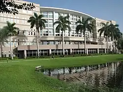 The William and Norma Horvitz Administration Building, a two-story 62,000-square-foot (5,800 m2) postmodern structure, was built at a cost of $3 million,[43][44] which houses the office of the president and numerous other administration departments.[45] In 2001, the Alvin Sherman Library for Research and Information Technology Center was completed and also serves as the largest public library facility in the state of Florida.[46] In 2004, the Carl DeSantis Building opened, housing the H. Wayne Huizenga School of Business and Entrepreneurship.[47] The building is a 261,000-square-foot (24,200 m2), five-story facility, and cost about $33 million.[48][49]