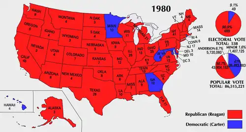 - Former California Governor Ronald Reagan was elected President of the United States in a landslide victory over incumbent President Jimmy Carter. Carter conceded defeat at 9:50 p.m. Eastern time in Washington, D.C., while voting was still in progress on the U.S. Pacific coast. Reagan won the most votes in 44 of the 50 states of the U.S. and received 489 of the 538 electoral votes. With 43,903,230 votes against Carter's 35,480,115 and 5,719,850 from independent challenger John B. Anderson, Reagan had a majority of the popular vote and was sworn in on January 20 as the 40th President of the United States.[12] Carter carried only his state of Georgia, Vice President Walter Mondale's state of Minnesota, and West Virginia, Maryland, Hawaii, Rhode Island and the District of Columbia. Anderson's best showing was in Massachusetts, where he won more than 15% of the popular vote. The vote took place exactly one year after the beginning of the Iran hostage crisis, which was still ongoing at the time of the election.