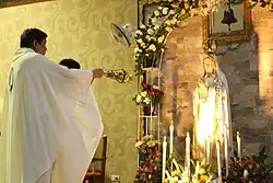 In Christian communities of the Philippines and Latin America, novena traditions include devotional rituals in front of an altar, with nine levels where the Holy Cross is placed at the top.[40] These are lit up with candles, decorated with flowers and other ritual items. Additionally, the space may have many statues decorated, and these statues typically include those of Virgin Mary, Apostles and saints of regional significance. The first day, the votive candles are placed on level one, and with each day the candles are raised by one level towards the Holy Cross. Further, each day includes congregational prayers, hymn singing with music, private and public devotionals. Some novenas include, sometimes on the last day, community fiesta events over beverages, refreshments or processions.[41][40]