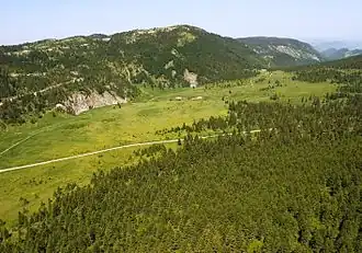 It has two peaks higher than 2,000 m (6,562 ft). The highest is Pogled at 2,156 m (7,073 ft), and the other is Beleg at 2,142 m (7,028 ft). The Pogled peak is shared between Serbia and Kosovo, while Beleg is on the tripoint. The peak Berim is also part of this mountain.[2] In Kosovo, the town of Istog lies just south of the mountain on the Metohija plain, which borders the mountain to the south.