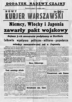 ![]() Front page of Nowy Kurjer Warszawski on 27 September 1940 announcing the signing of the Tripartite Pact | |