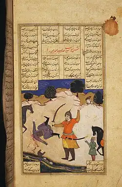 While Nowzar tried to stabilize Iran, Pashang, the Turanian king, sent his son, Afrasiab, to invade the weakened kingdom of Iran.[1][2] Nowzar led an army against the invaders, but he was captured and killed by Abrasiab.[1][2]