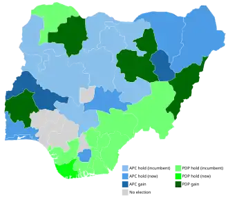 - ^ In 2015, APC's candidate Abubakar Audu won the Kogi gubernatorial election but died shortly afterwards. As runner-up in the APC primary, Yahaya Bello was declared Governor-elect.