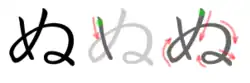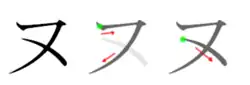 Nu, ぬ in hiragana, or ヌ in katakana, is one of the Japanese kana each representing one mora. Both hiragana and katakana are made in two strokes and represent [nɯ]. They are both derived from the Chinese character 奴. In the Ainu language, katakana ヌ can be written as small ㇴ to represent a final n, and is interchangeable with the standard katakana ン.
