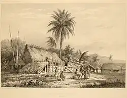 A lithograph from 1846 titled "Cases de naturels à Nouka-Hiva".[14]