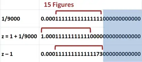 The last two examples illustrate what happens if x is a rather small number. In the second from last example, x = 1.110111⋯111 × 2−50 ; 15 bits altogether. The binary is replaced very crudely by a single power of 2 (in this example, 2−49) and its decimal equivalent is used. In the bottom example, a decimal identical with the binary above to the precision shown, is nonetheless approximated differently from the binary, and is eliminated by truncation to 15 significant figures, making no contribution to 1 + x − 1 , leading to x = 0 .[b]