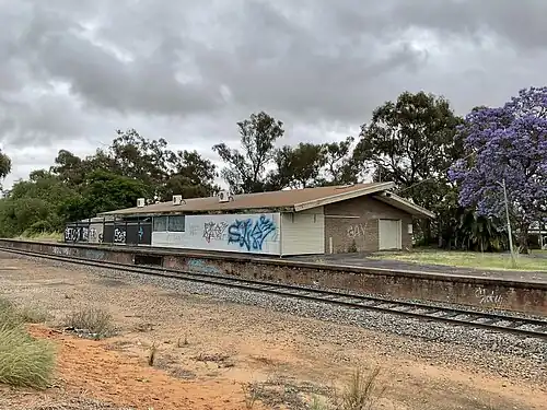 New station buildings were opened on 29 May 1969,[3] and were refurbished in 1985.[4] Passenger services beyond the station to Cobram were discontinued in 1981, as part of the New Deal timetable, but were resumed in 1983. The final closure of the Cobram passenger service was in 1993, when it was cut back to Shepparton.[2]
