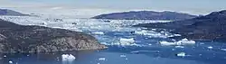 Aerial view of Nunatakassak and the Ikerasaa strait between the Kullorsuaq and Saqqarlersuaq islands.