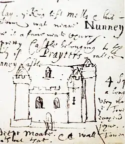The tower-keep had a modest entrance, which was reached by a draw-bridge that lay across the surrounding moat, which initially reached right up to the base of the castle.[2] A simple, 12-foot (3.6 m) high bailey wall, with minimal defensive value, surrounded the moat, which was in contrast wide, 10-foot (3 m) deep, and would have been difficult for an attacker to drain.[6][7][12][13] On the east side of the castle Nunney Brook was used as a line of defence rather than a bailey wall.[7]